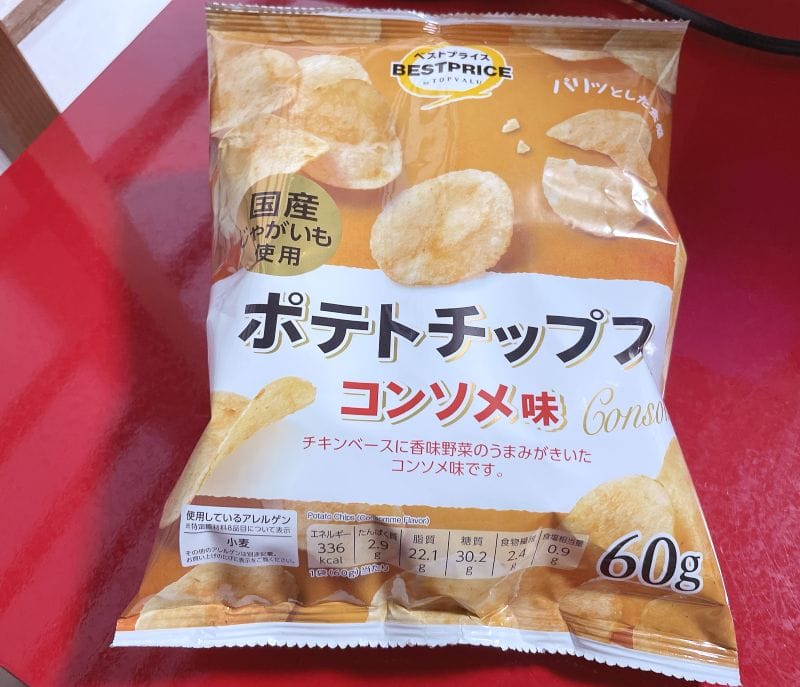 イオン系のスーパーでよく見かける、黄色いパッケージが印象的な「ベストプライス ポテトチップス コンソメ」。